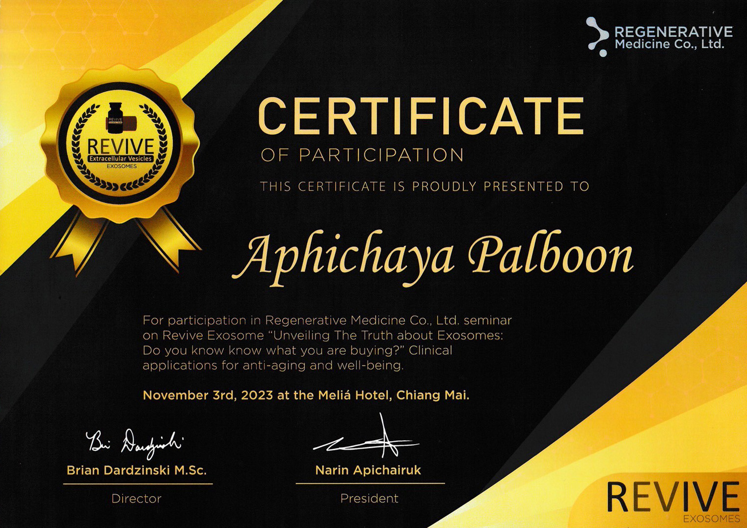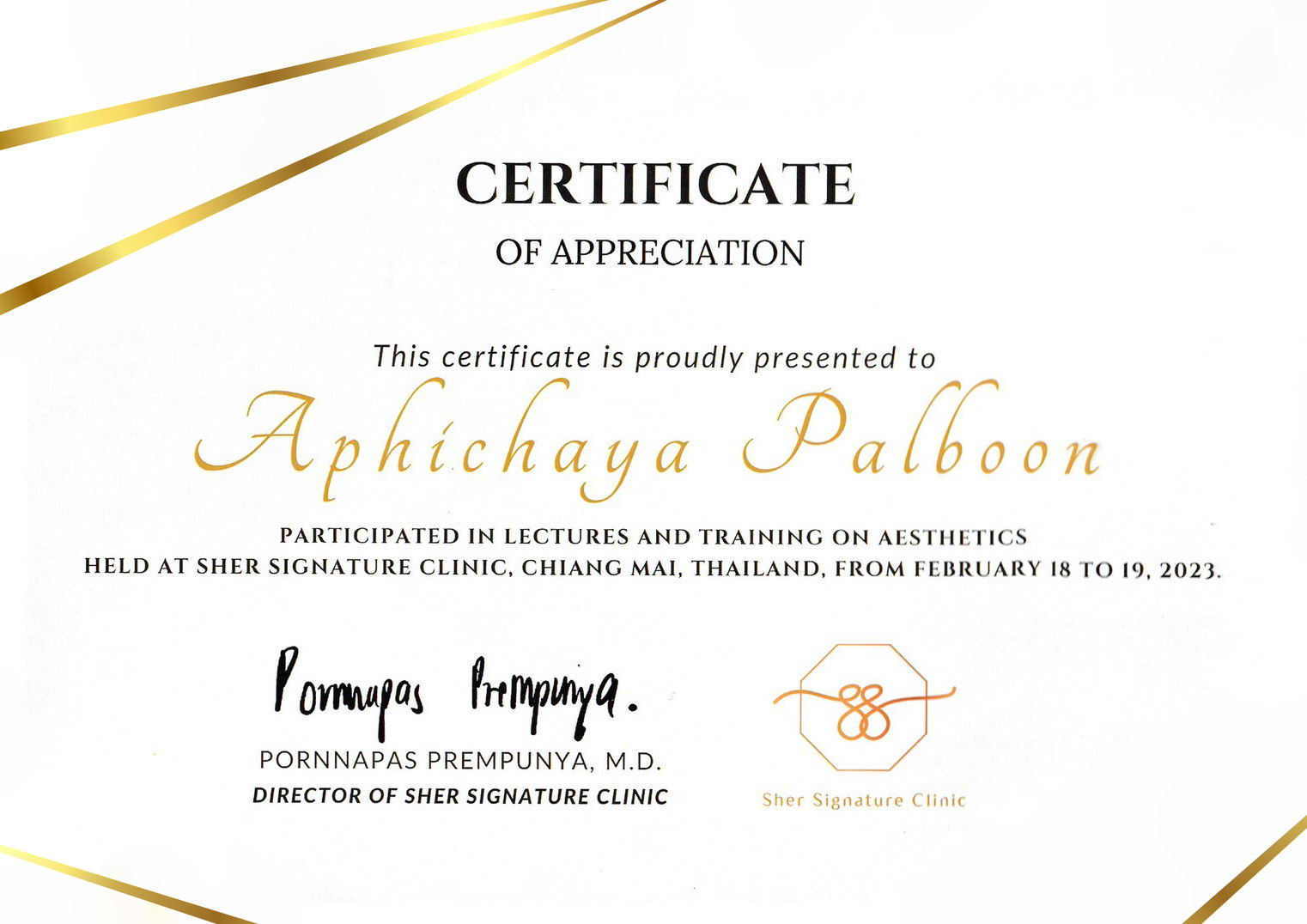 - ประกาศนียบัตร อบรมการฉีดสารลดเลือนริ้วรอย (โบท็อก) และการฉีดสารเติมเต็ม จากเชอร์ ซิกเนอเจอร์ คลินิกเวชกรรม จังหวัดเชียงใหม่