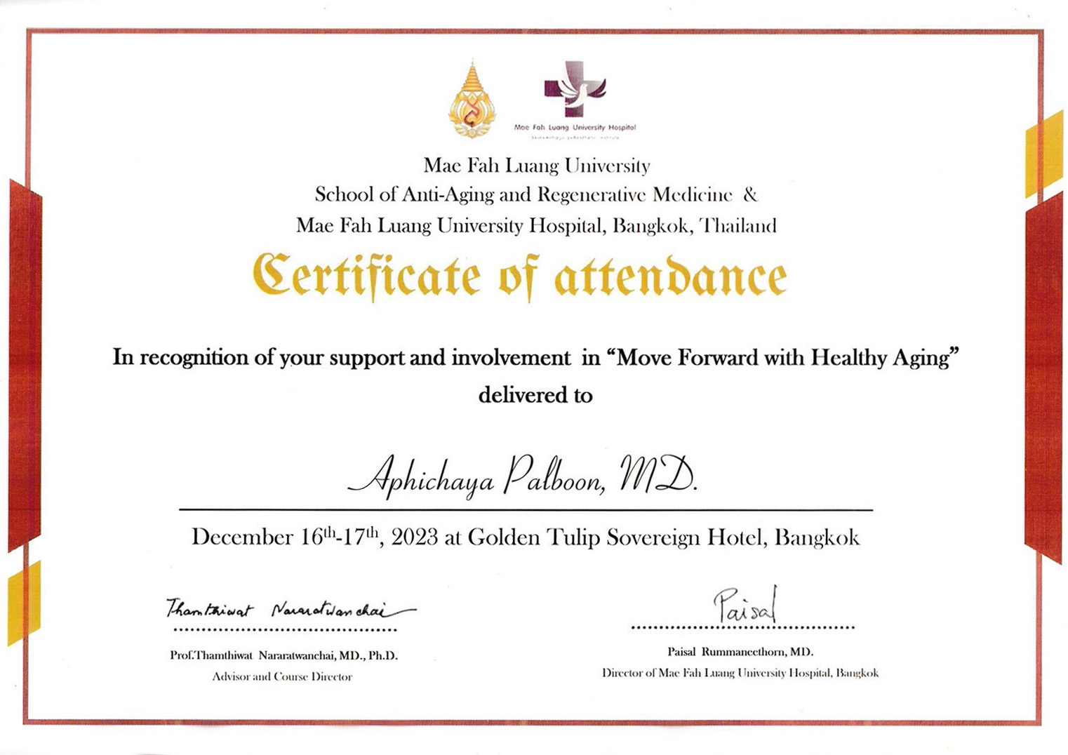 - ประกาศนียบัตร อบรมเวชศาสตร์ความงามและเวชศาสตร์ชะลอวัย จากสำนักเวชศาสตร์ชะลอวัยและฟื้นฟูสุขภาพ มหาวิทยาลัยแม่ฟ้าหลวง