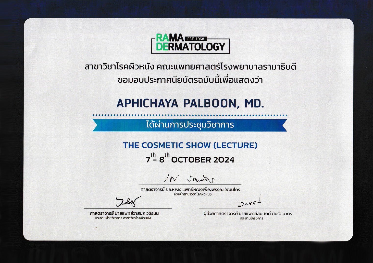 - ประกาศนียบัตร อบรมโรคผิวหนังและความงาม ภาควิชาตจวิทยา คณะแพทยศาสตร์ โรงพยาบาลรามาธิบดี